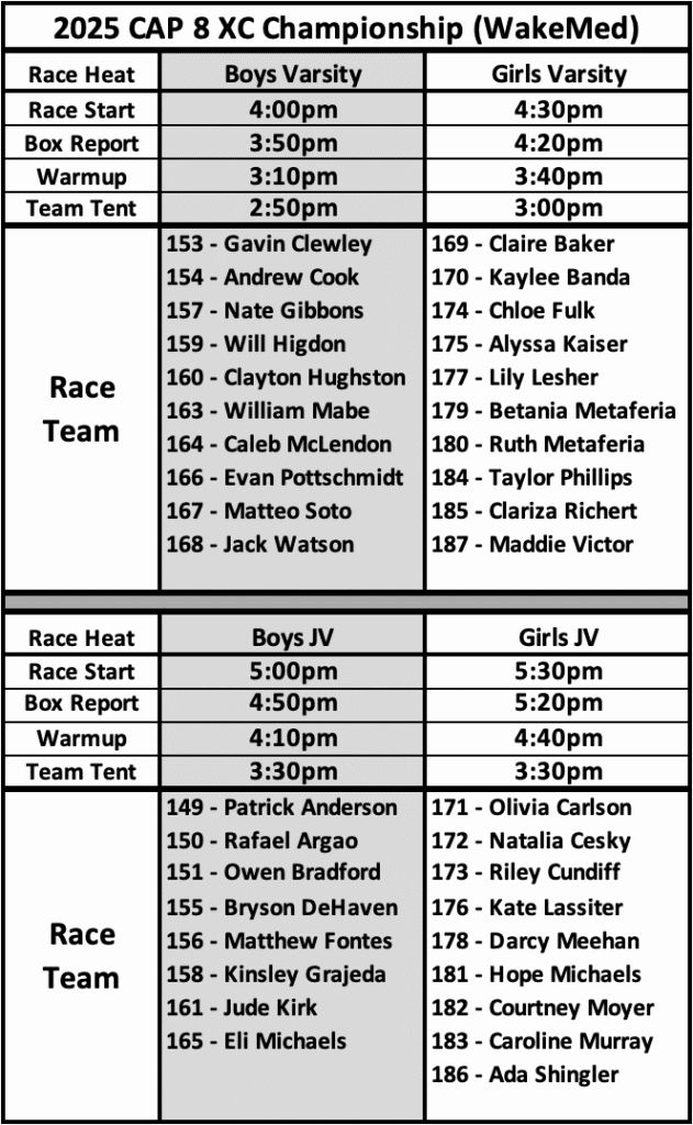 3:30 pm – CAP 8 Coach’s Meeting / Conference (@ Finish Line)