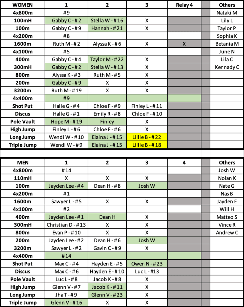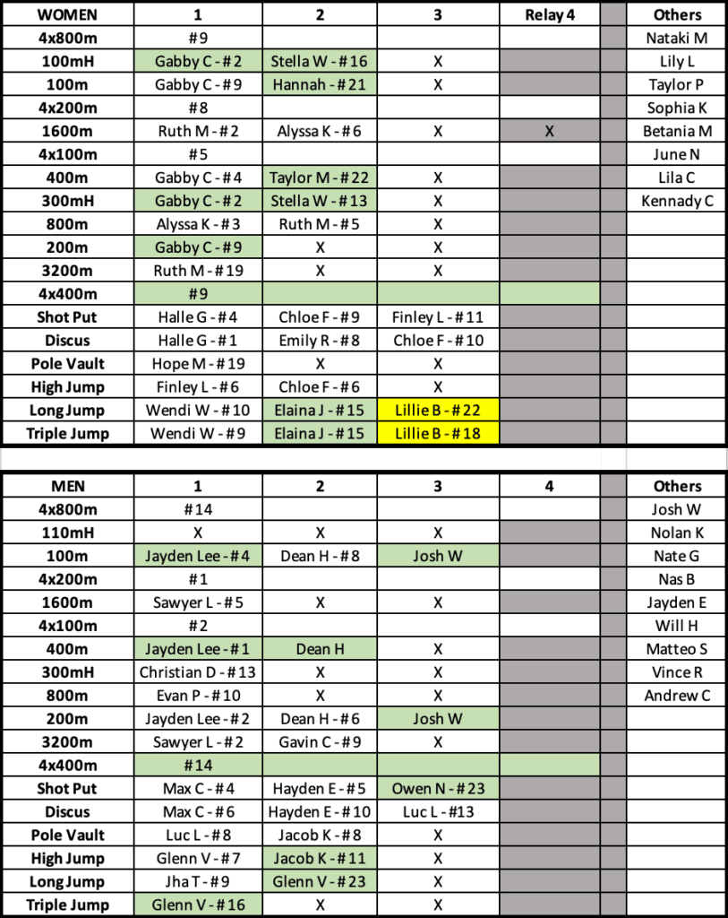 Athletes in GREEN are entered for Sanderson Last Chance on 4/30