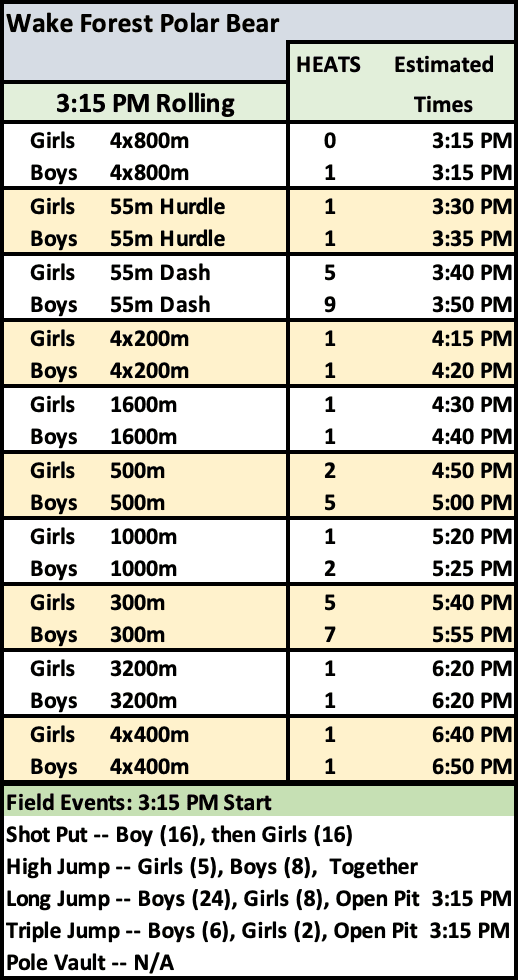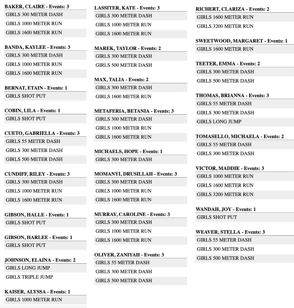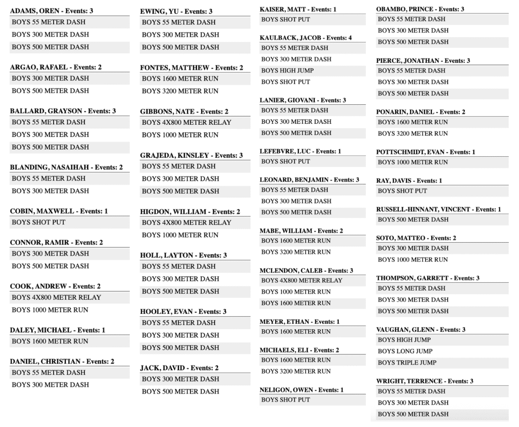 Athletes Entered, Listed Below… some Athletes are entered in more than 1 Event. After finishing Event 1, we plan to go to Event 2… however, we may decide to scratch Event 2 depending on Athlete readiness (in some cases, we drop Event 2 and go on to Event 3). After finishing Event 2, same thing, if there is an Event 3, we assess readiness after Event 2. The best Athletes adjust to performing multiple Events.